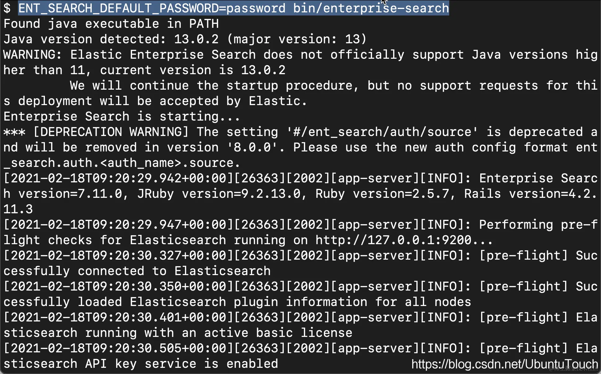 在上面,我们可以看到 enterprise-search 用户的密码是 password。这个就是我们在命令行中定义的密码。我们也可以看到如下的信息: