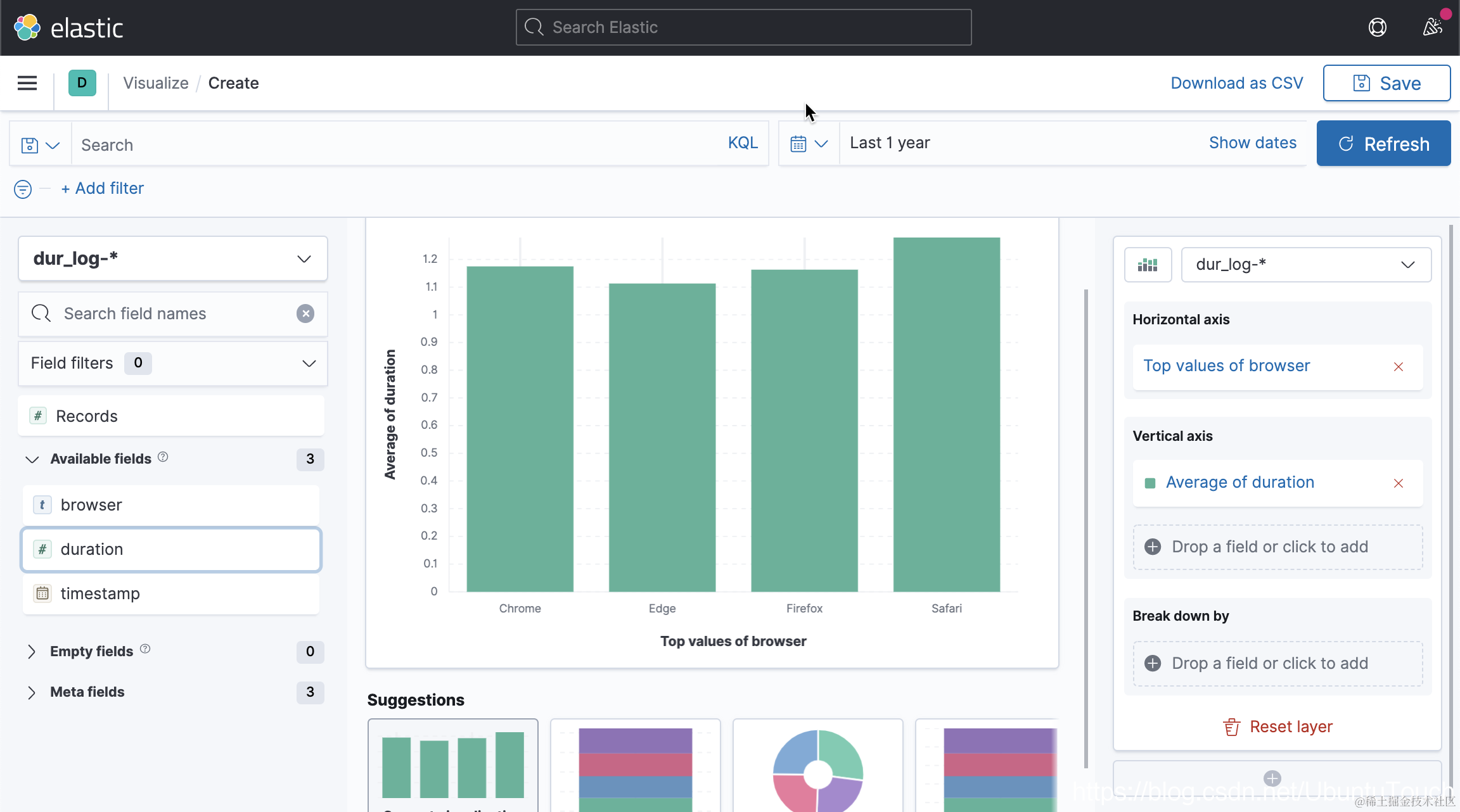 从上面,我们可以看出来,Firefox 的值比其它的浏览器的值显然高的太多了。明显显示它的单位是不对的。那么我们如何修改这个错误呢,一种办法是我们重新修改我们的数据源,并把 Firefox 的 duration 的值除以 1000,并重新导入,或者使用 ingest pipeline 在导入的过程中进行处理。那么有没有一种办法在不重新导入的情况下能展示正确的数据呢?