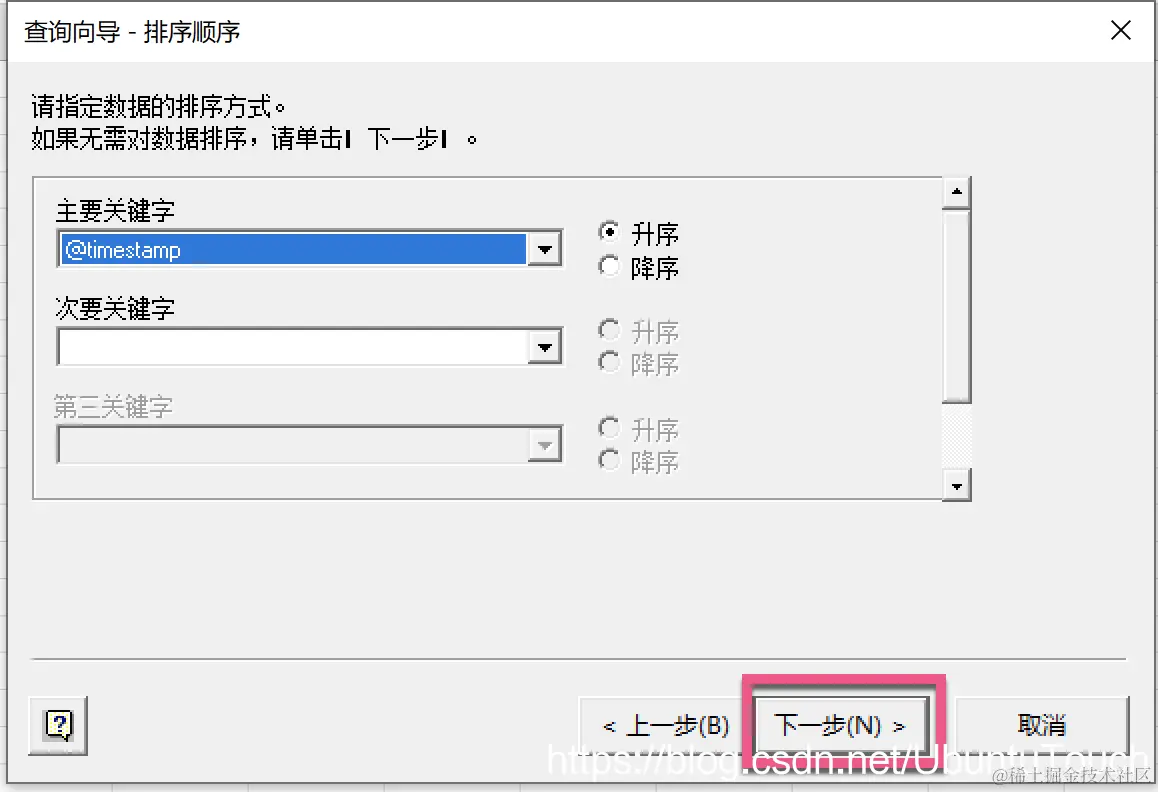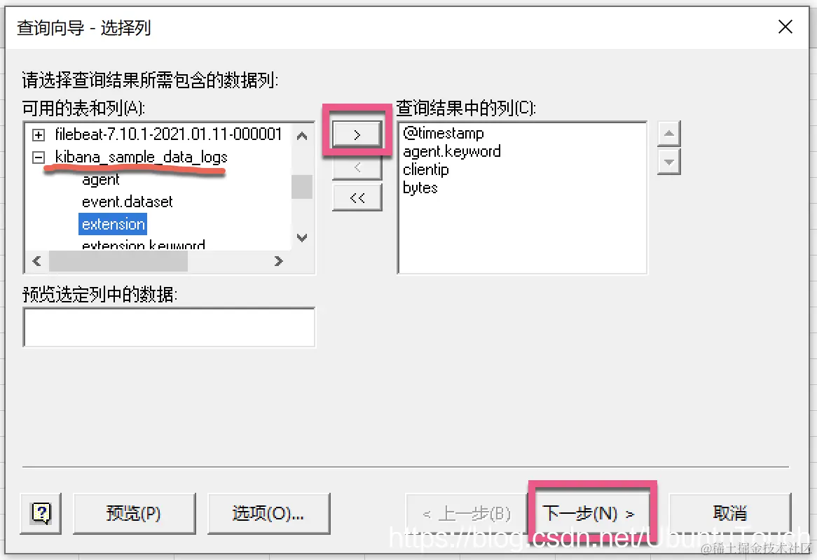 我们选择喜欢的索引,并选中其中想要的字段。点击 > 符号,并把相应的字段选入。选完后,点击 “下一步”: