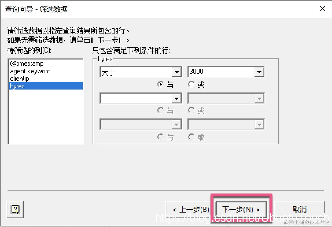 我们可以分别对相应的字段进行查询。例如,在上面,我们只对 bytes 大于3000 的文档感兴趣。等我们选择完后,点击 “下一步”: