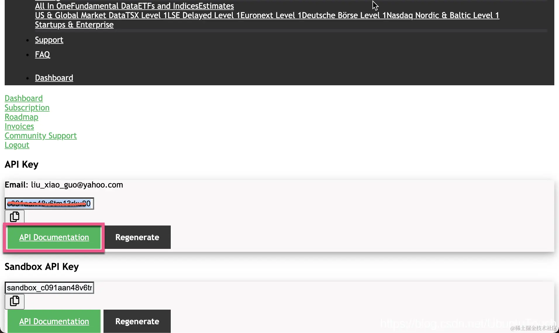 当你签名过后,你可以看到如下所示的 API key: