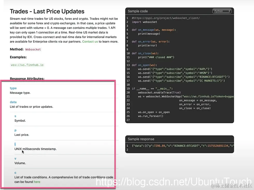 在左边我们点击 Trades,然后拷贝自己的代码并保存到本地文件 finnhub-websockets.py 中: