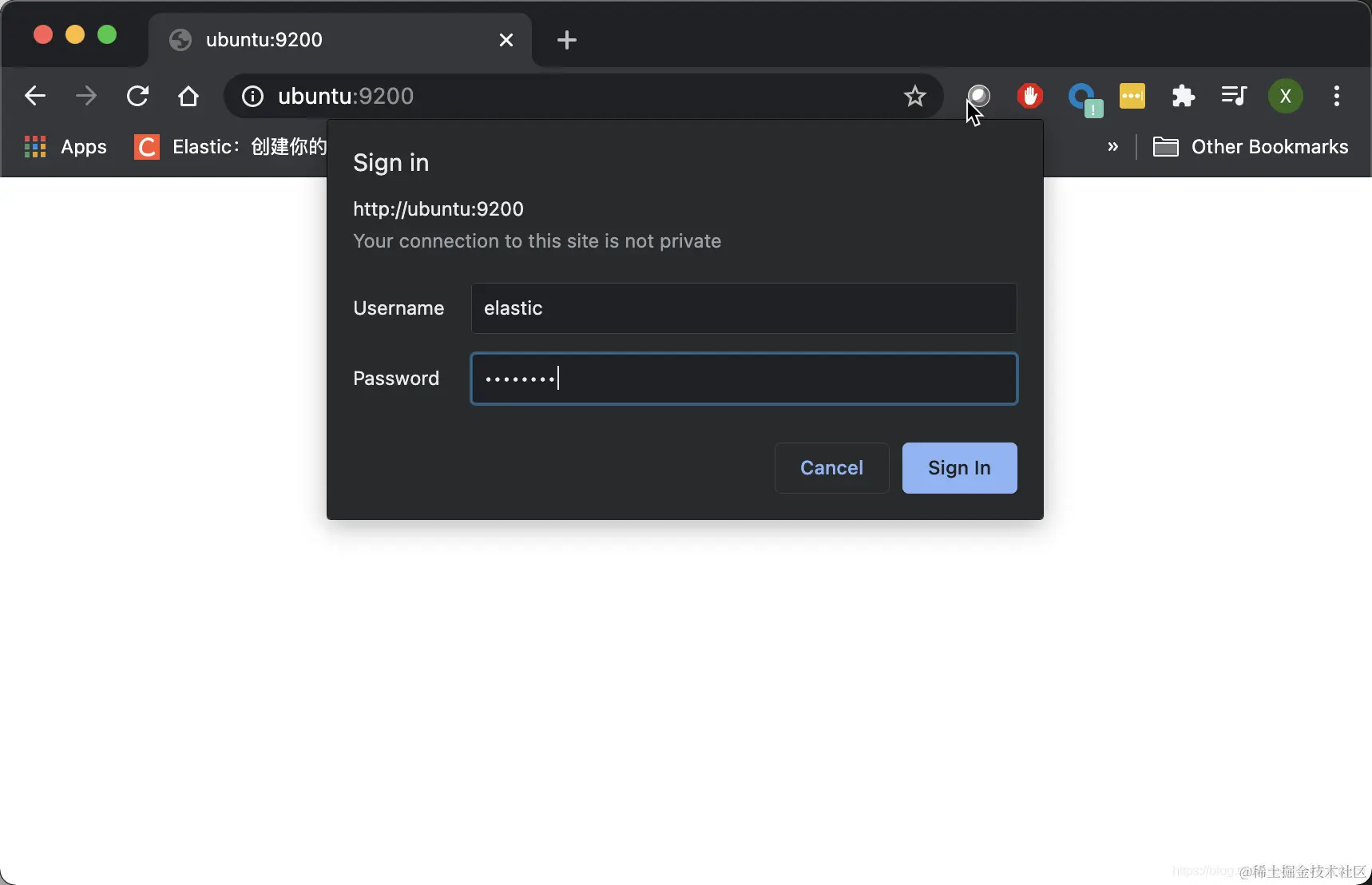 经过上面的设置后,我们在其它的机器上访问 Ubuntu 系统上的机器,我们需要使用 elastic/password 来进行访问: