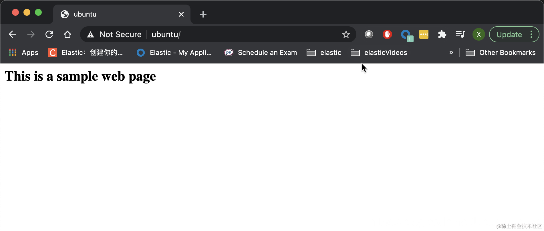 我们可以在 MacOS 电脑的浏览器中打入如下的命令来检查我们的 apache 服务器是否已经安装成功了 http://ubuntu:80: