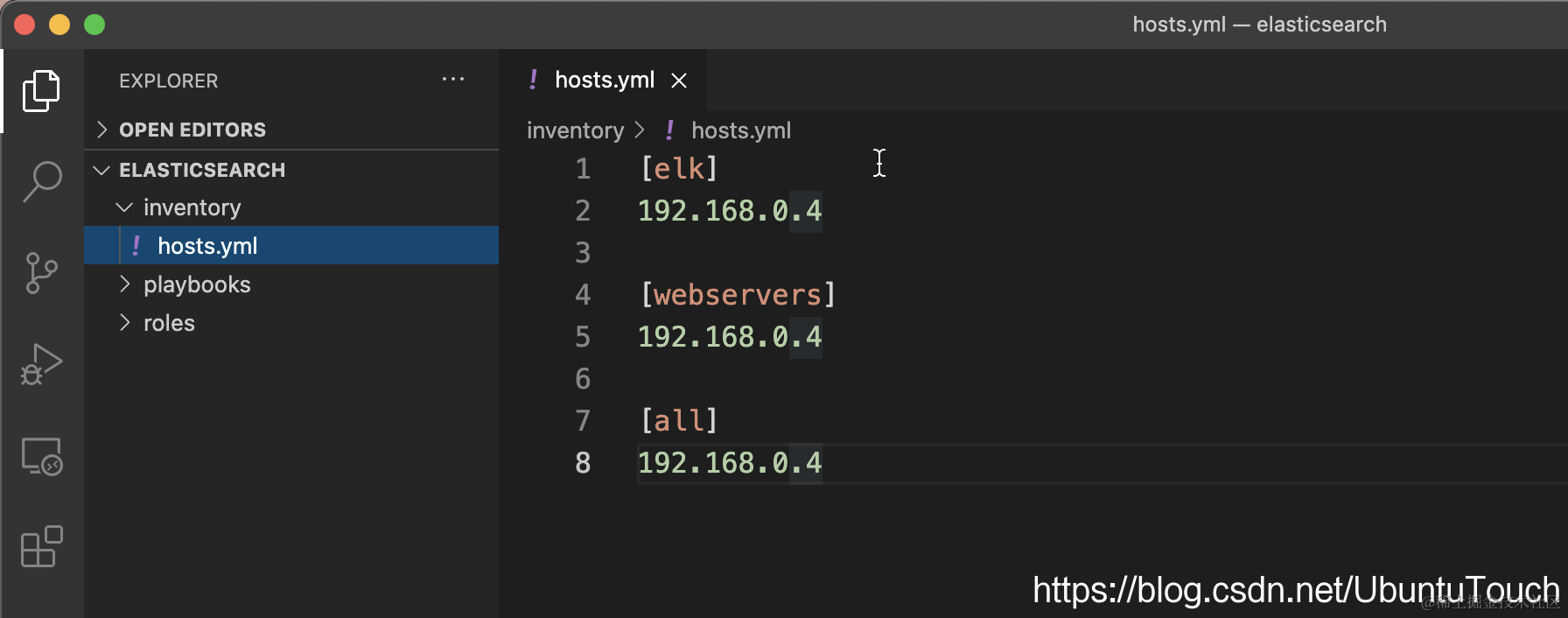 在上面,我们在用户的 home 目录中创建一个叫做 ansible/elasticsearch 的目录。这个目录就是我们的 elasticsearch 项目的工作目录。在这个目录下,我们先创建一个叫做 inventory 的子目录,并在这个目录下创建一个叫做 hosts.yml 的文件。hosts.yml 文件的内容如下:
