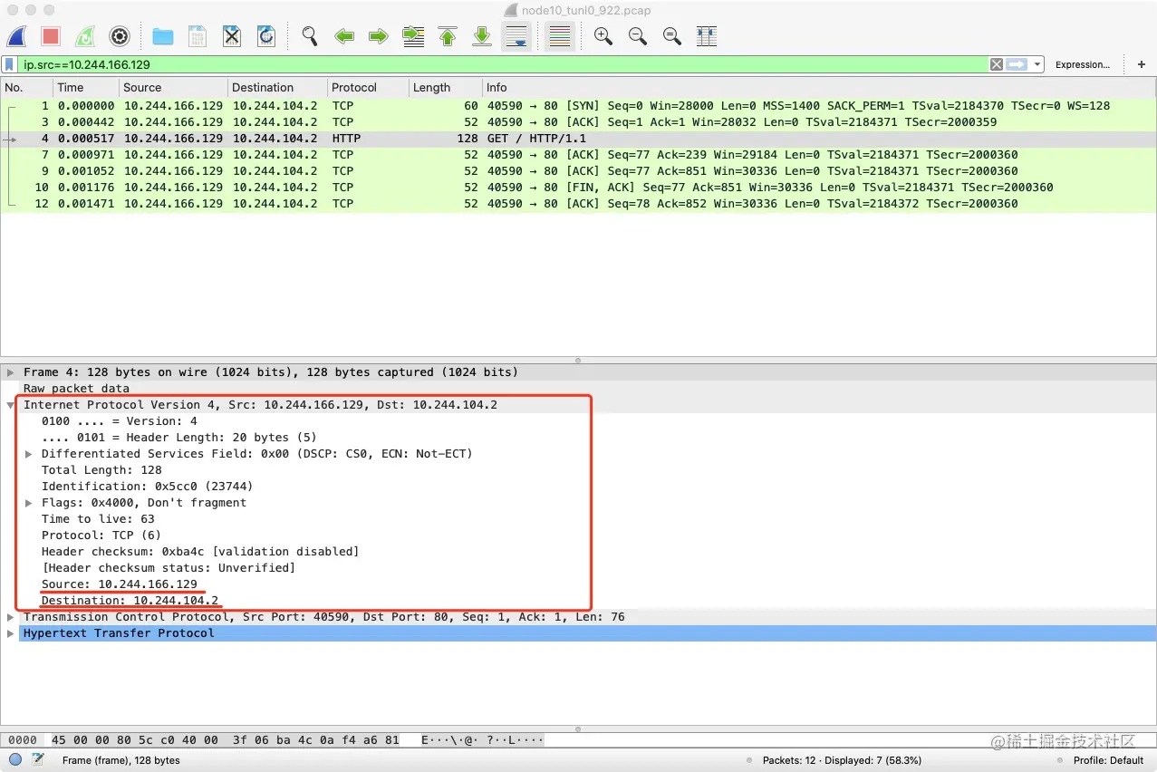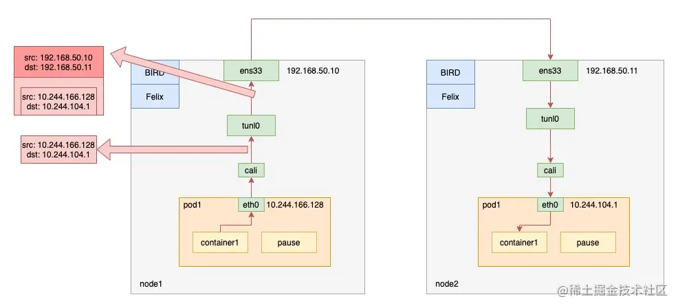 可以看到,IP 包在 tunl0 设备中被封装进了另一个 IP 包,其目的 IP 为 node2 的 IP,源 IP 为 node1 的 IP。