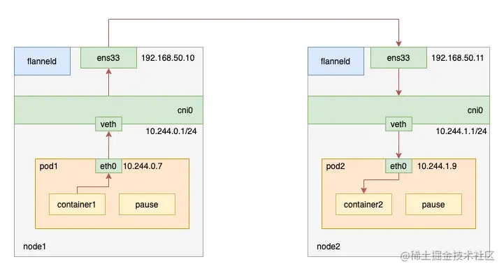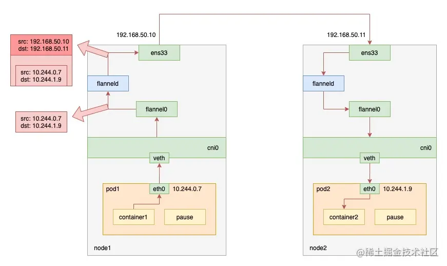 node1 上的 pod1 请求 node2 上的 pod2 时,流量的走向如下: