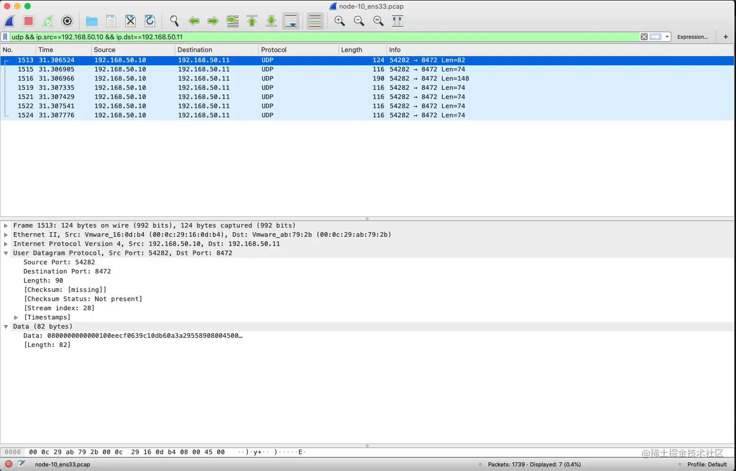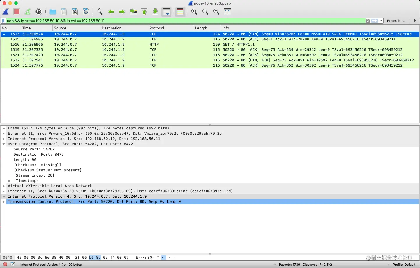 可以看到源 ip 为 pod1 ip、目的 ip 为 pod2 ip,并且该 IP 包被封装在 UDP 包中。