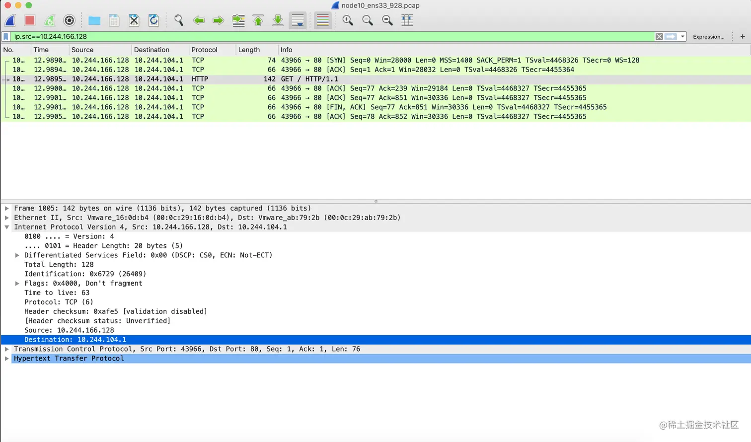 与上面一样,从 node1 上的 pod1 发送一个 http 请求到 node2 上的 pod2。
