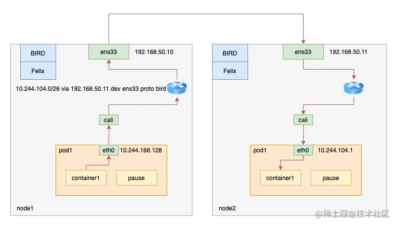 其中,第 2 条的路由规则表明 10.244.104.0/26 网段的数据包通过 bird 协议由 ens33 设备发往网关 192.168.50.11。这也就定义了目的 ip 为 node2 上 pod 请求的走向。第 3 条路由规则与之类似。