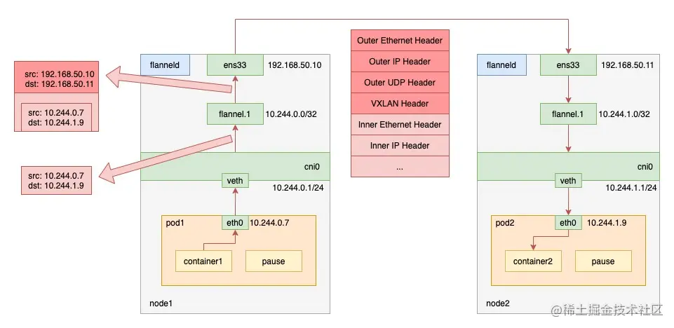 VXLAN 模式的 flannel 会在节点上创建一个叫 flannel.1 的 VTEP (VXLAN Tunnel End Point,虚拟隧道端点) 设备,跟 UDP 模式一样,该设备将二层数据帧封装在 UDP 包里,再转发出去,而与 UDP 模式不一样的是,整个封装的过程是在内核态完成的。