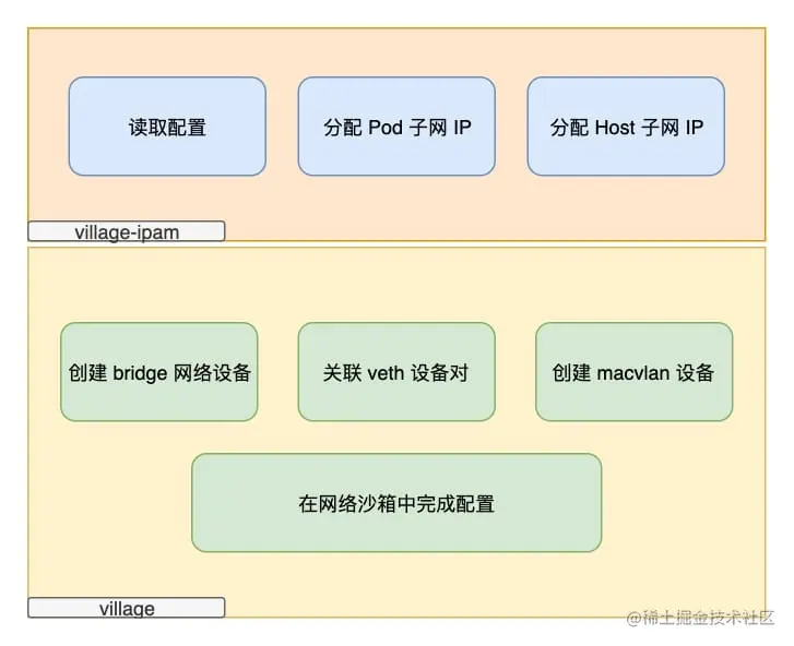 和前面提到的 CNI 的工作流程一致,village net 也是分为 main 插件和 ipam 插件。