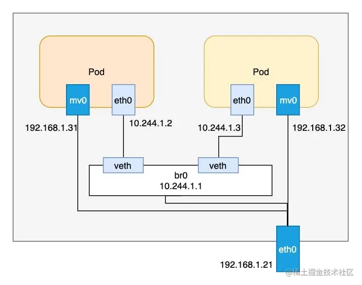 为了解决 cluster ip 无法正常工作的问题,便舍弃了只是用 macvlan 的念头,使用多网络接口进行组网。