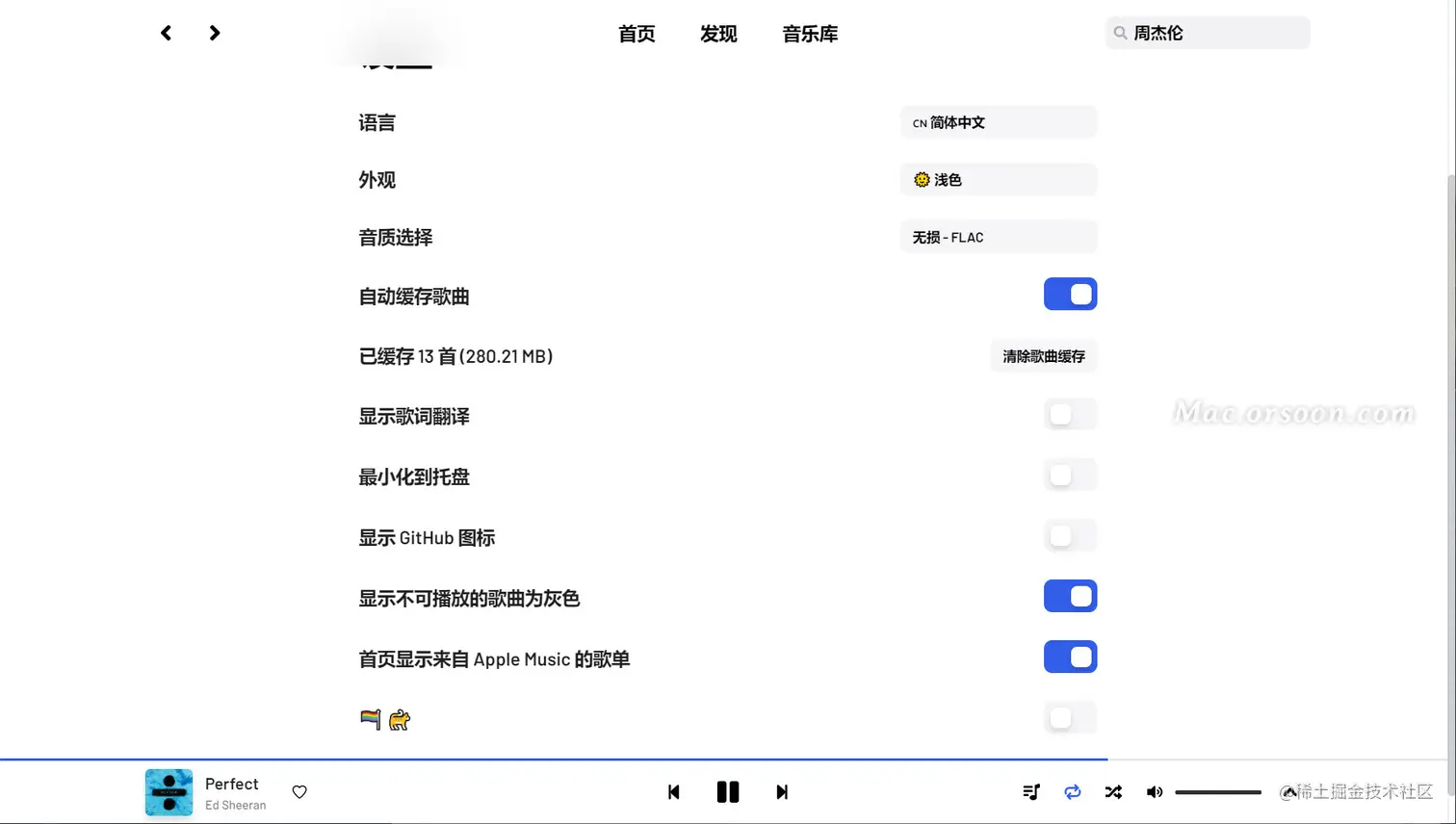 YesPlayMusic 还能结合 MacBook Pro 的 Touch Bar 进行使用,便利进行切换暂停播放等操作。在设置内还有各种不同的定制设置,可以根据需求进行调整。