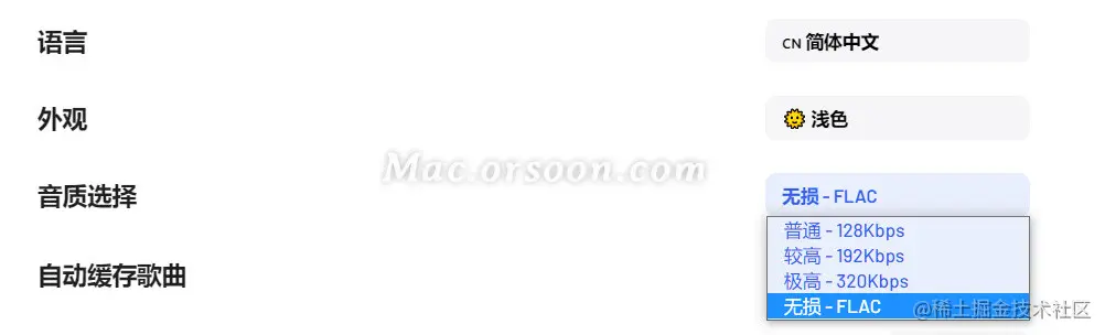 音质方面,用户可以在设置内选择歌曲默认音质:共有普通(128Kbps)、较高(192Kbps)、极高(320Kbps)和无损(FLAC)四档选择。