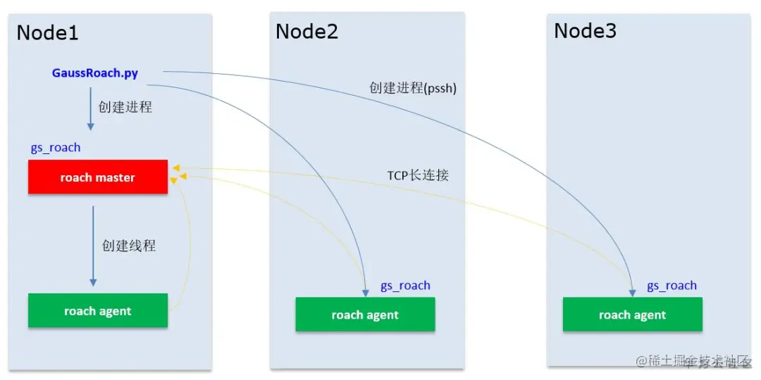 GaussDB(DWS)提供的Roach是一个分布式的备份恢复工具,以一个Node1、2、3组成的集群为例,备份的总入口是python进程GaussRoach.py,它将在当前节点拉起一个roach master进程,在集群其他所有节点各拉起一个roach agent进程,是典型的master-slave框架,master进程与所有的agent进程分别建立TCP长连接,并封装报文与各个节点通信,下发备份等任务,在每个节点上,将分布式地为节点上的CN、DN等数据库对象进行备份。