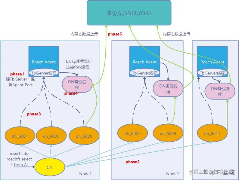 - Phase1: 备份数据的命令被Master下发给所有Agent,连一个CN,连数据库创建外表导出server、创建导出外表,每个节点的Roach Agent同样会创建一个TblServer线程,监听Agent Port端口,等待DN连接;