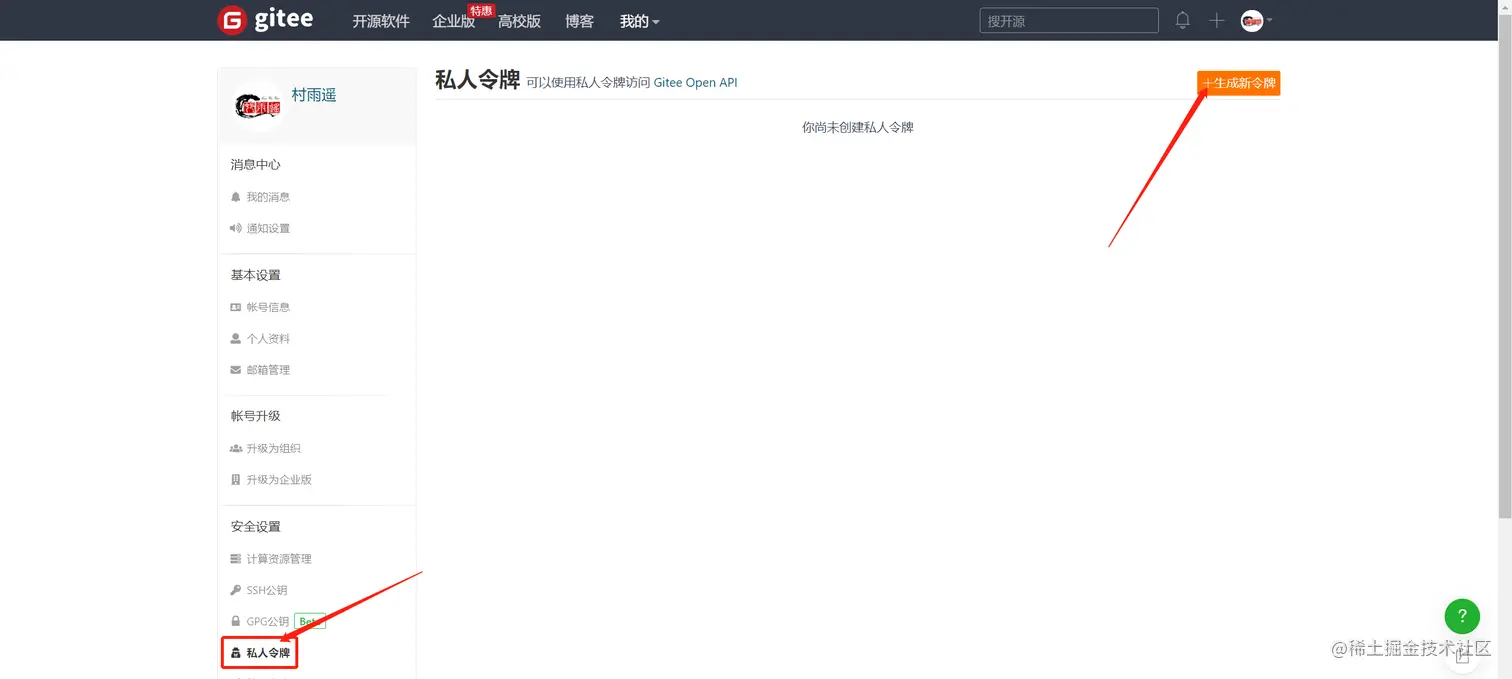 以此打开 设置 -> 私人令牌,最后点击右上角 生成新令牌;