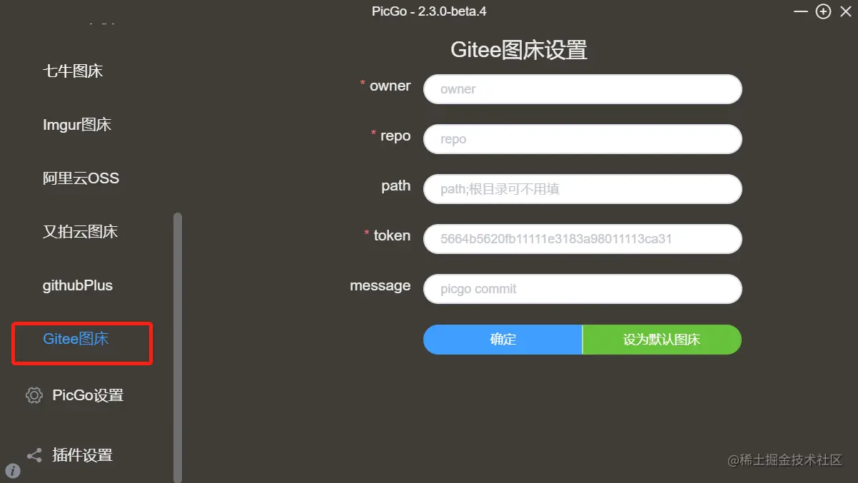确定即可,要将其作为默认图床的话,点击设为默认图床,其中的相关信息如下:- repo:就是刚才创建的 用户名/仓库名;