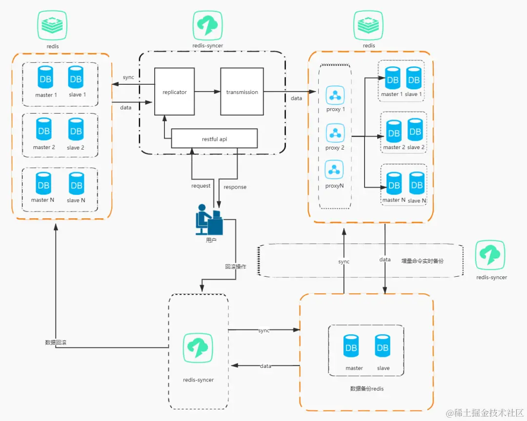 正因如此, 应运而生。_RedisSyncer 是京东云用于在 redis 之间数据同步的产品,支持跨版本、异构集群间的数据同步。_它模拟了redis的replication协议,在rdb版本不⼀致时进⾏命令转换,以实现跨rdb版本迁移,并通过缓存value的⽅式完成INCR、INCRBY、DECR、DECRBY等⾮命令的幂等转换。最终适应云上与云下、原生与托管等多种场景,能够快速灵活地满足用户的同步、迁移、扩容的需求。