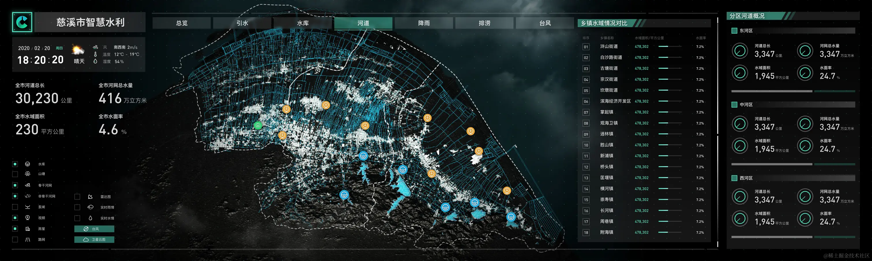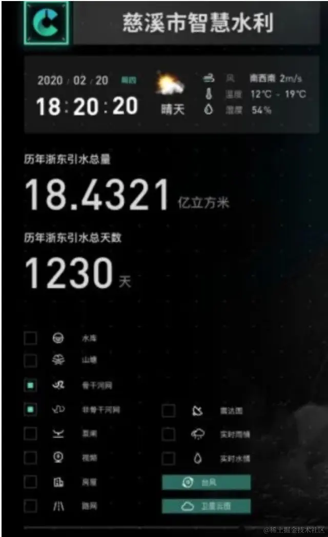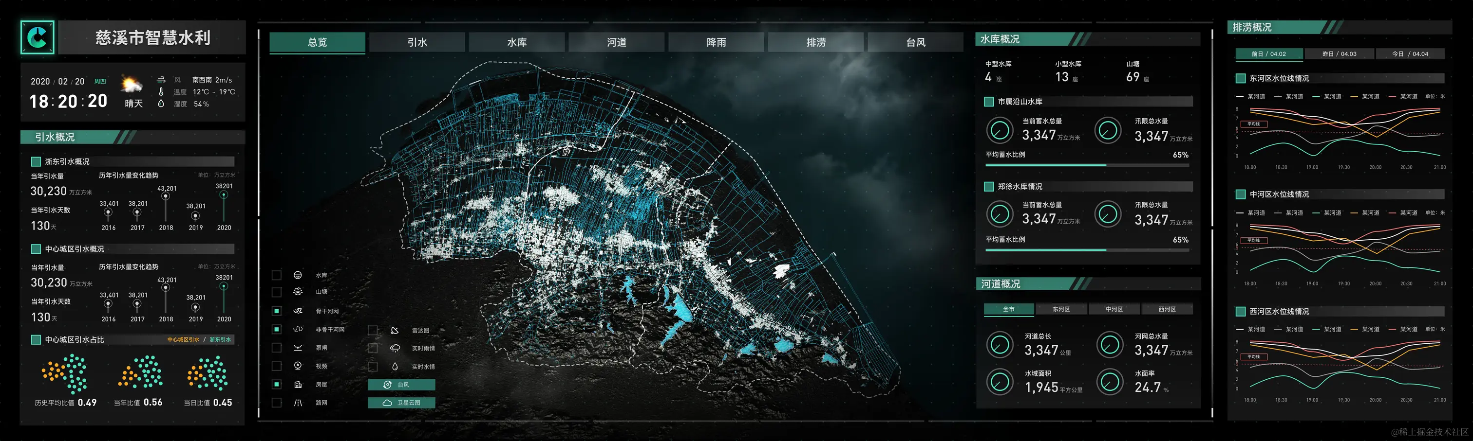 从内容上,大屏基于GIS地图实现了对全市河道分布、水位数据、水库设备、引水情况、台风监控、雨量监控、排涝数据等各项重要指标的可视化展示和实时化动态更新。