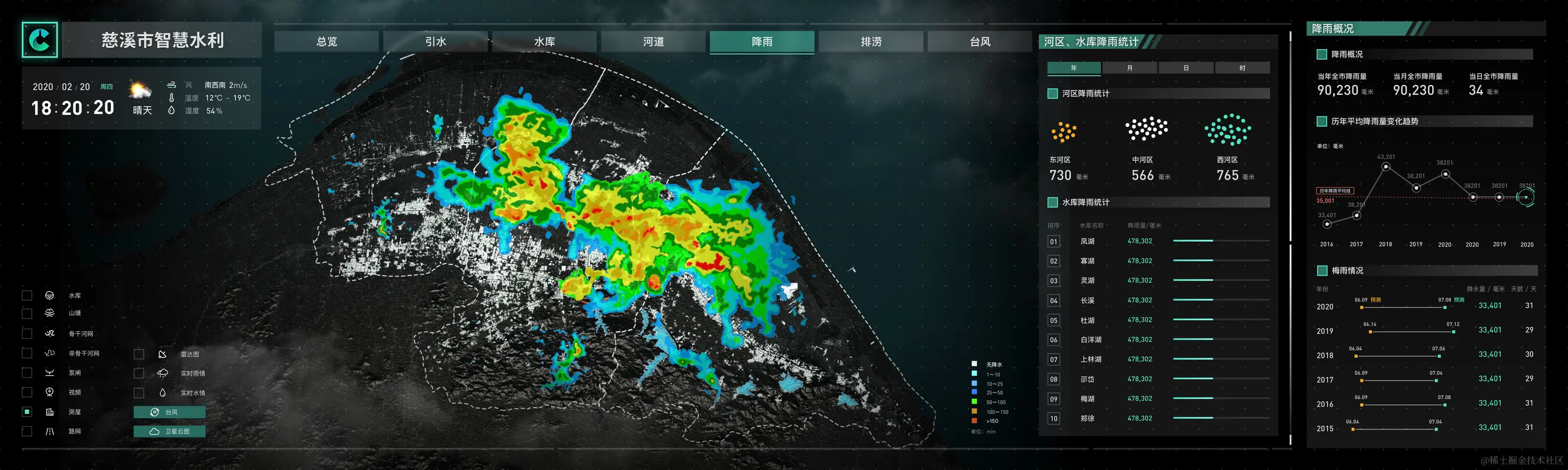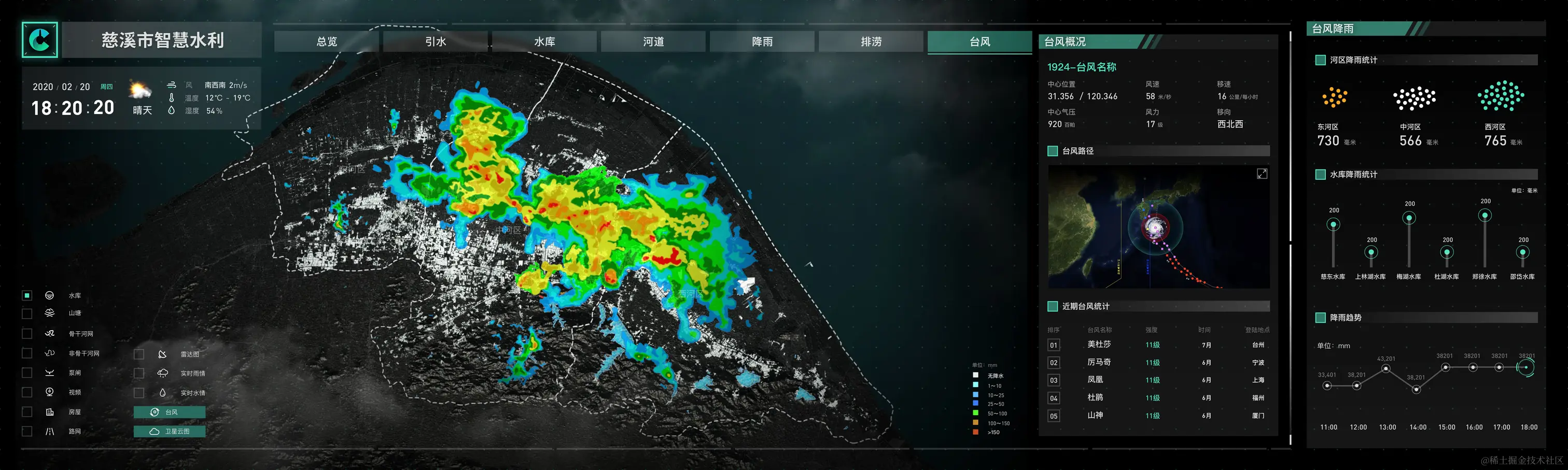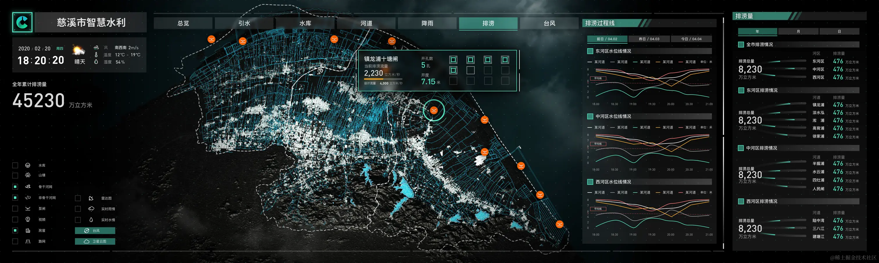 从内容上,大屏基于GIS地图实现了对全市河道分布、水位数据、水库设备、引水情况、台风监控、雨量监控、排涝数据等各项重要指标的可视化展示和实时化动态更新。