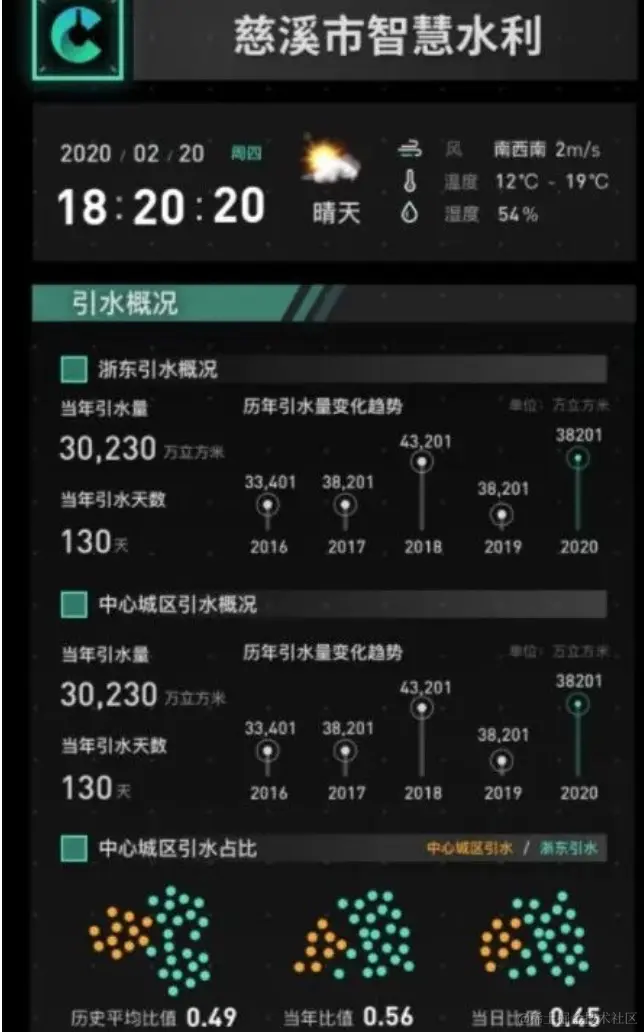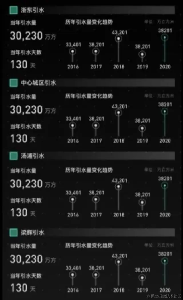 引水页的左屏展示总体数据,即总的引水量与引水天数;右屏则是分地区的历年引水量数据。