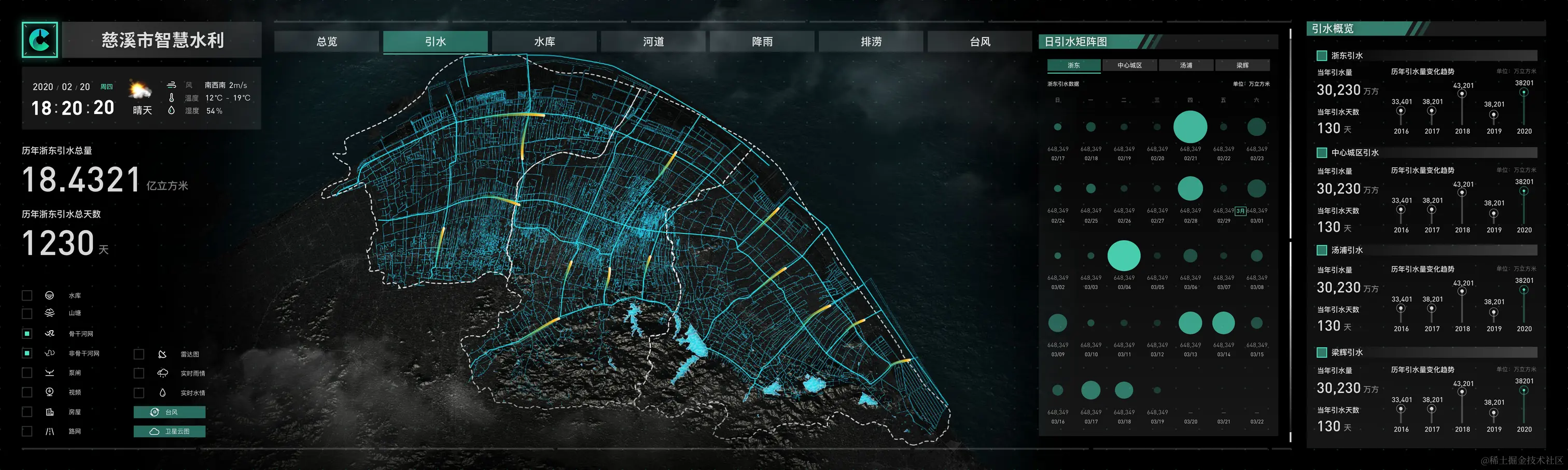 接下来是引水页,引水页的主屏地图展示骨干/非骨干河网分布信息,侧边展示日引水矩阵图,用大小不同的圆点表示引水量数据大小。