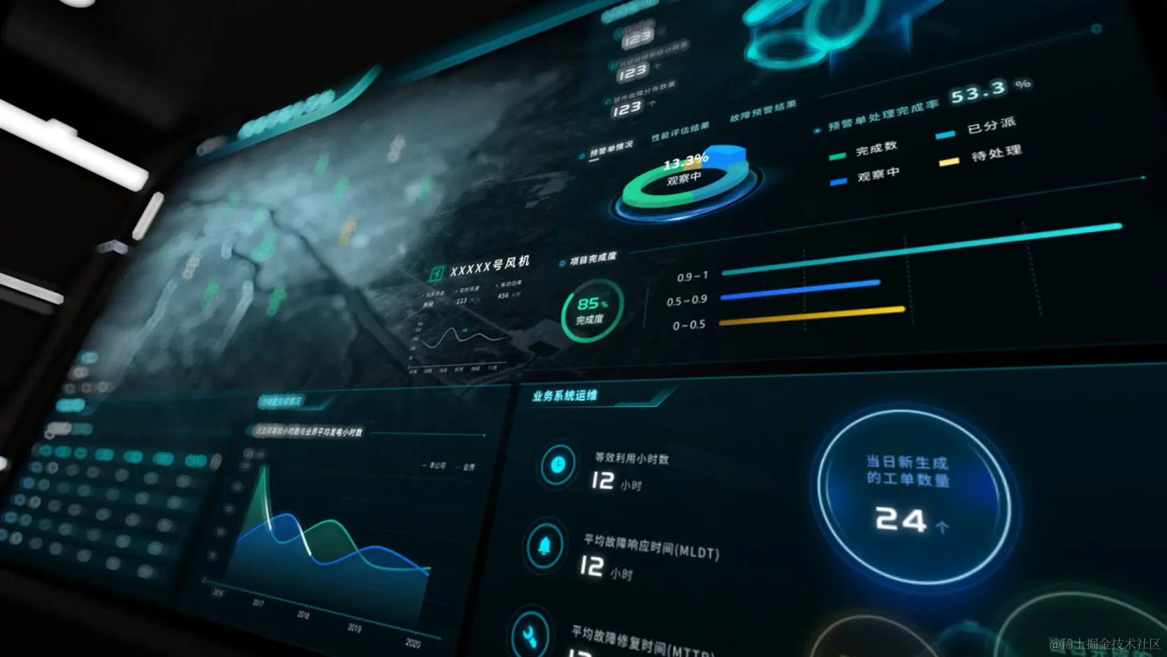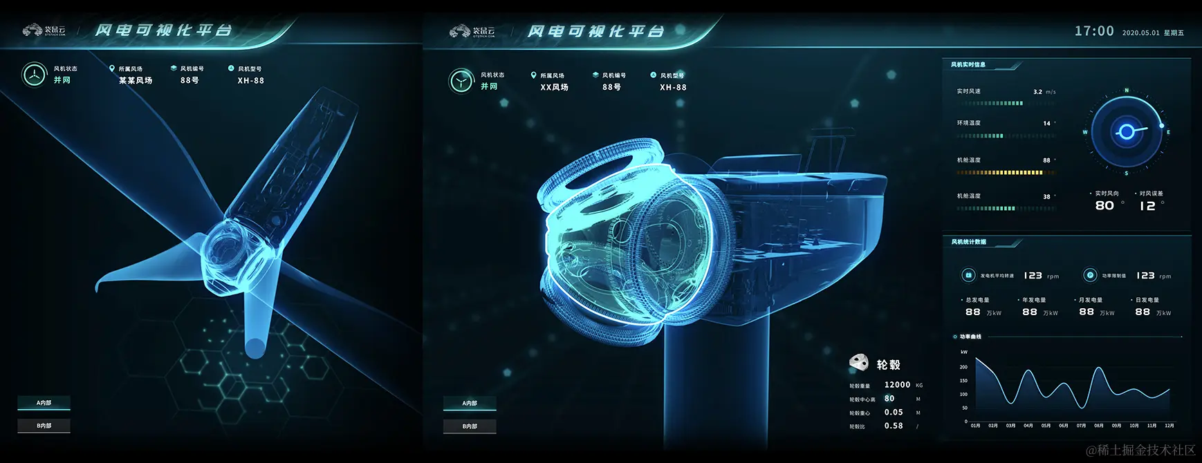 与文本或图形块相比,图像在社交媒体上的共享性也更高;比如下面这个大屏案例,一个风电行业的大屏,以炫酷的风机动画为主视觉元素,模拟风机转动的感觉,让受访或投资者可以清晰感知到一个风机发电的运行状态。