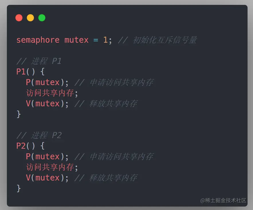 用户进程可以通过使用操作系统提供的一对原语来对信号量进行操作,从而很方便的实现进程互斥或同步。这一对原语就是 PV 操作: