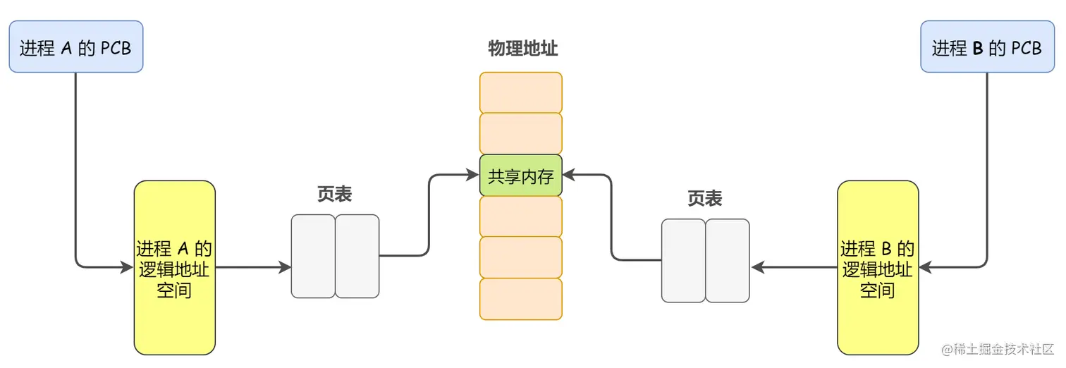 集合内存管理的内容,我们来深入理解下共享内存的原理。首先,每个进程都有属于自己的进程控制块(PCB)和逻辑地址空间(Addr Space),并且都有一个与之对应的页表,负责将进程的逻辑地址(虚拟地址)与物理地址进行映射,通过内存管理单元(MMU)进行管理。两个不同进程的逻辑地址通过页表映射到物理空间的同一区域,它们所共同指向的这块区域就是共享内存。
