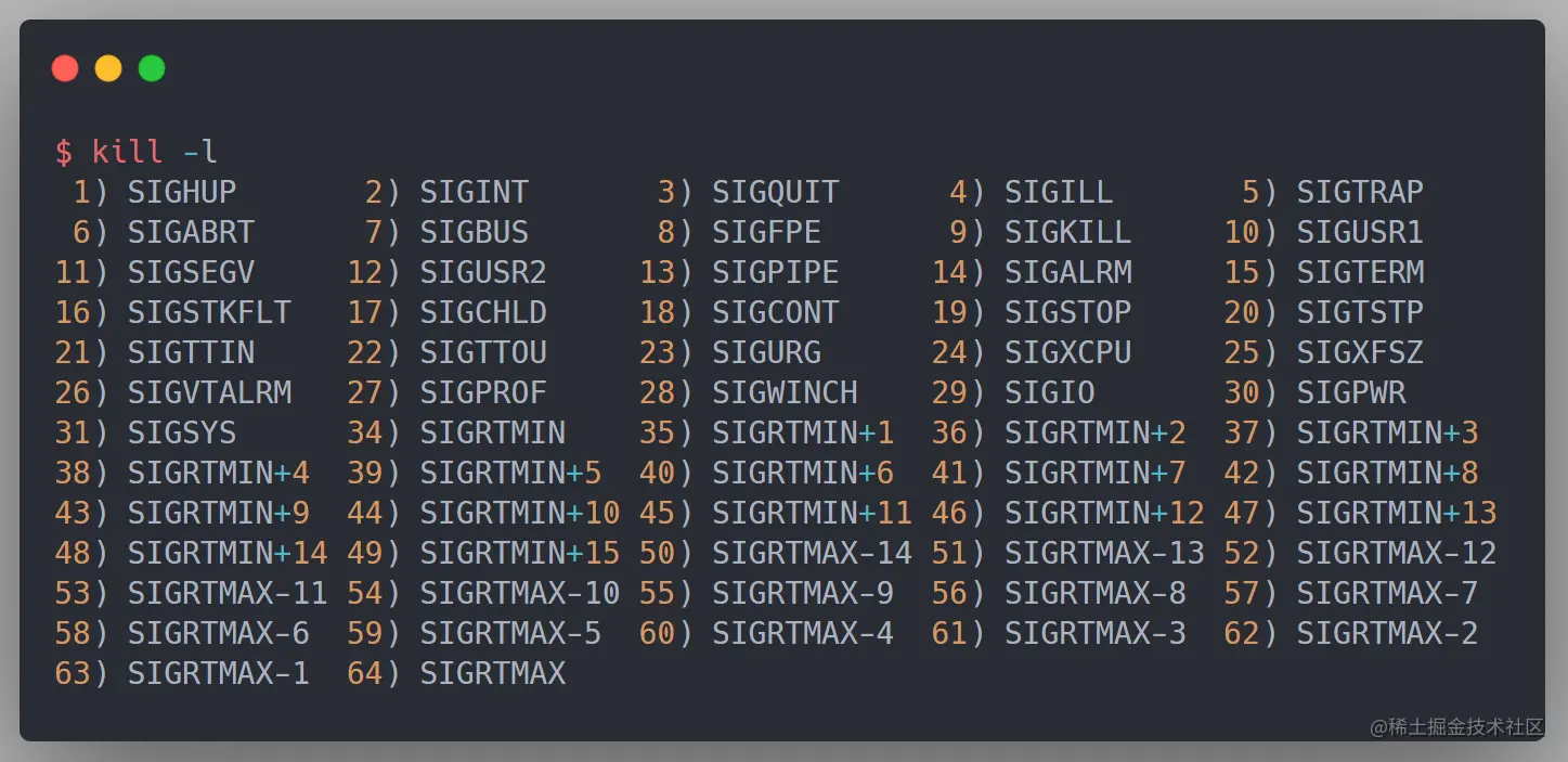信号事件的来源主要有硬件来源和软件来源。所谓硬件来源就是说我们可以通过键盘输入某些组合键给进程发送信号,比如常见的组合键 Ctrl+C 产生 SIGINT 信号,表示终止该进程;而软件来源就是通过 kill 系列的命令给进程发送信号,比如 kill -9 1111 ,表示给 PID 为 1111 的进程发送 SIGKILL 信号,让其立即结束。我们来查看一下 Linux 中有哪些信号: