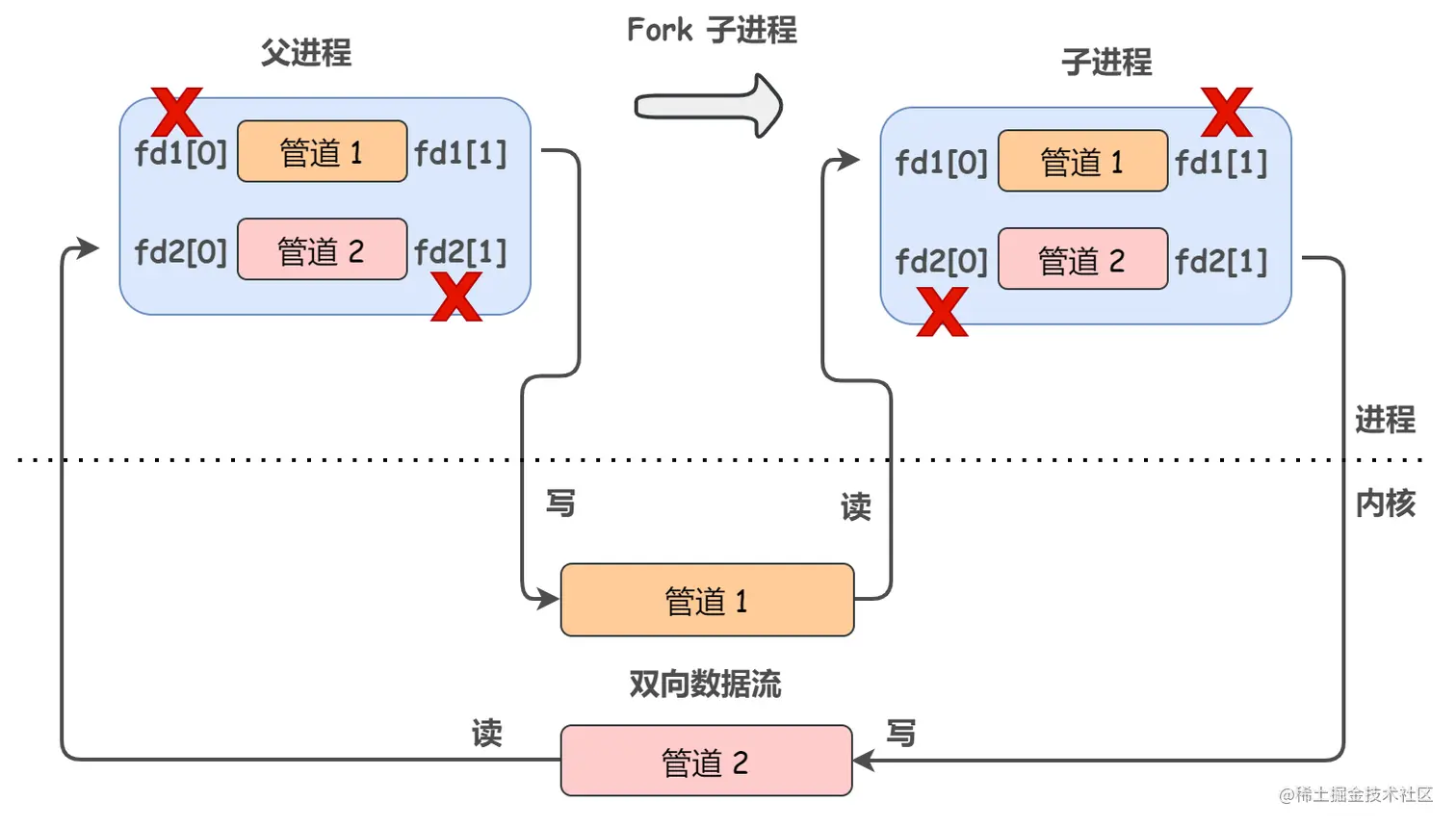 fd[0]指向管道的读端,fd[1]指向管道的写端fd[1]的输出是fd[0]的输入