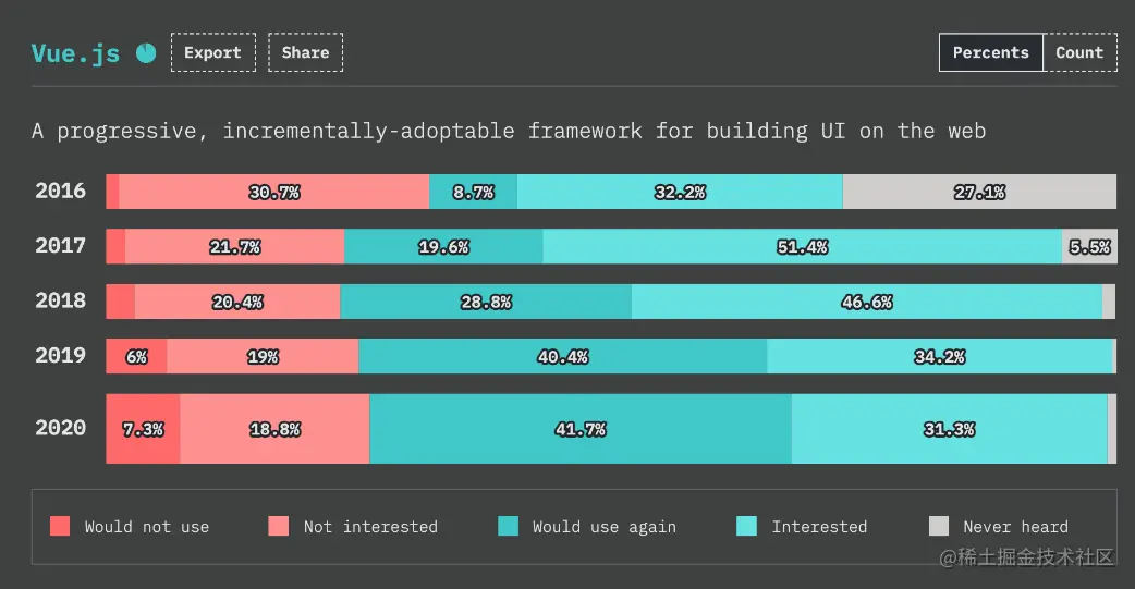 在如今被三大框架支配的前端领域,已经很少有人不知道 Vue 了。2014 年,前 Google 工程师尤雨溪发布了所谓的渐进式(Progressive)前端应用框架 Vue,其简化的模版绑定和组件化思想给当时还是 jQuery 时代的前端领域产生了积极而深远的影响。Vue 的诞生,造福了那些不习惯 TS 或 JSX 语法的前端开发者。而且,Vue 较低的学习门槛,也让初学者非常容易上手。这也是为什么 Vue 能在短时间内迅速推广的重要原因。从 State of JS 的调查中可以看到,Vue 的知名度接近 100%,而且整体用户满意度也比较高。