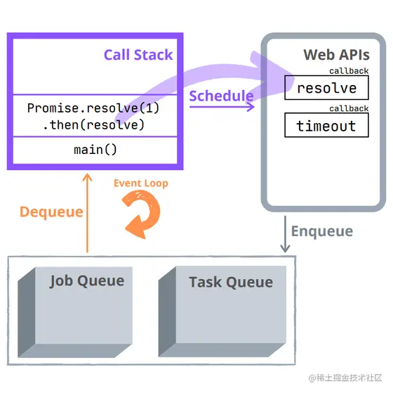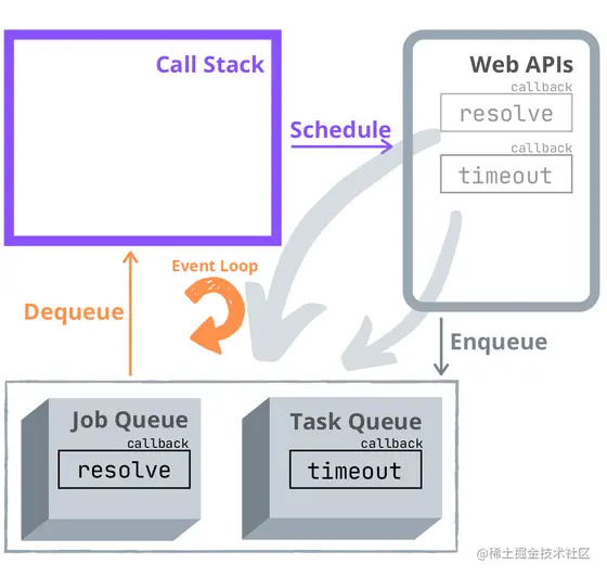 是由于事件循环的“优先级”使任务队列(存储已实现的 promise 的回调)中的任务从任务队列(存储超时的setTimeout() 回调)中的任务中出队。
