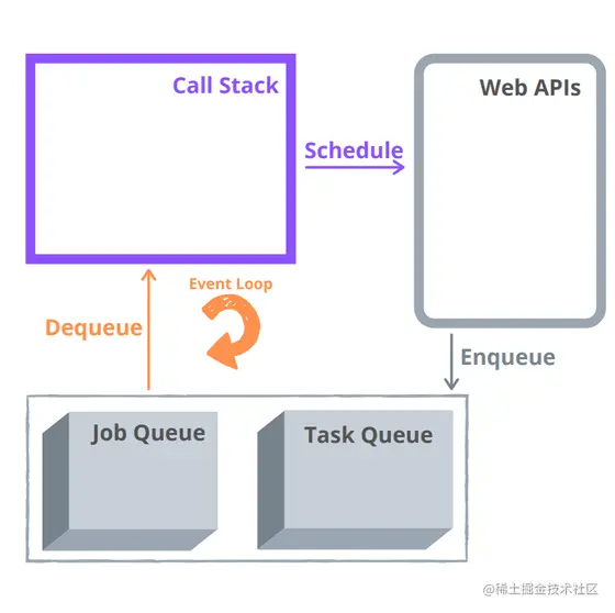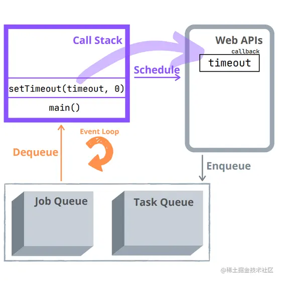 - 1、调用堆栈执行 setTimeout(..., 0) 并“安排”一个计时器。 timeout() 回调存储在 Web API 中: