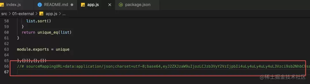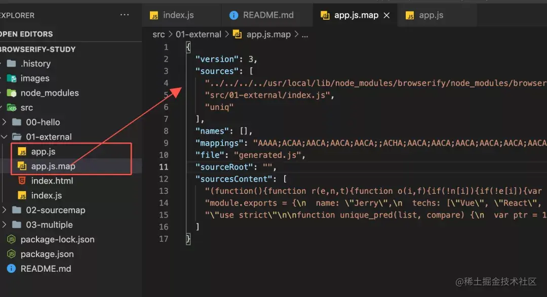 执行后你就会发现,你的 app.js 和 它对应的 sourcemap 文件已经分离了: