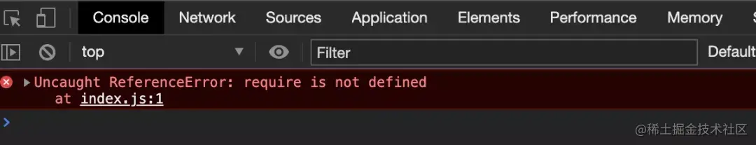 我们知道,这个 index.js 文件是可以直接在 node 环境下运行的,但是在浏览器上运行会有什么效果呢?我们来试一下效果,在 index.html 中手动引入这个文件: