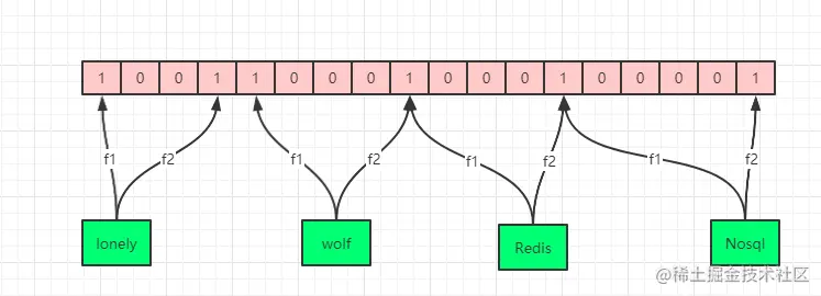 下图这个就是一个经过了 2 次哈希函数得到的布隆过滤器,根据下图我们很容易看到,假如我们的 Redis 根本不存在,但是 Redis 经过 2 次哈希函数之后得到的两个位置已经是 1 了(一个是 wolf 通过 f2 得到,一个是 Nosql 通过 f1 得到,这就是发生了哈希碰撞,也是布隆过滤器可能存在误判的原因)。