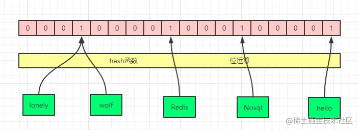 Redis 当中有一种数据结构就是位图,布隆过滤器其中重要的实现就是位图的实现,也就是位数组,并且在这个数组中每一个位置只有 0 和 1 两种状态,每个位置只占用 1 个字节,其中 0 表示没有元素存在,1 表示有元素存在。如下图所示就是一个简单的布隆过滤器示例(一个 key 值经过哈希运算和位运算就可以得出应该落在哪个位置):