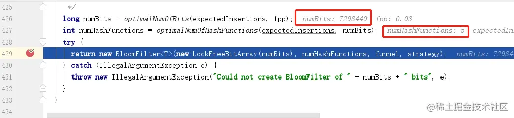 对于这个默认的 3% 的 fpp 需要多大的位数组空间和多少次哈希函数得到的呢?在 BloomFilter 类下面有两个 default 方法可以获取到位数组空间大小和哈希函数的个数:
