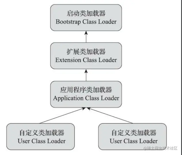 这个就是比较经典的双亲委派模型的三层模型,除了最顶端的启动类加载器是jvm通过c++语言来实现的之外,其他的类加载器全部都是java语言实现的,并且是独立于虚拟机外部的,所以提供了我们很大的操作空间。