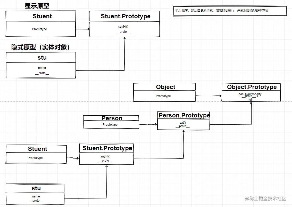 function Student(){} Student.prototype.sayHi=function(){console.log('hi')} var stu = new Student()如上,定义了一个Student对象,在对象的prototype上定义了一个sayHi方法,当实例化Student对象后,stu实体对象会存在__prto__属性指向Student的Prototype,而Student的Prototype也存在__proto__指向Object的Prototype