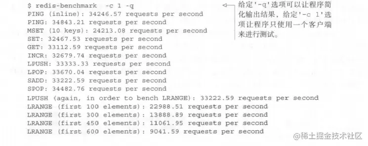 在考察 redis-benchmark 的输出结果时,切记不要将输出结果看作是应用程序的实际性能,这是因为 redis-benchmark 不会处理执行命令所获得的命令回复,所以它节约了大量用于对命令回复进行语法分析的时间。在一般情况下,对于只使用单个客户端的 redis-benchmark 来说,根据被调用命令的复杂度,一个不使用流水线的 Python客户端的性能大概只有 redis-benchmark 所示性能的 50%~60%。