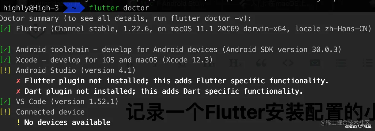最近准备研究Flutter,我的Mac上装了Flutter。Flutter下载配置环境之后,通过运行Flutter doctor,然后进行安装提示必要安装的东西。每安装过一个软件之后我都会再次运行flutter doctor命令,但是发现安装过Android Studio的Flutter plugin和Dart plugin之后,依然会提示着两个没有安装!!!