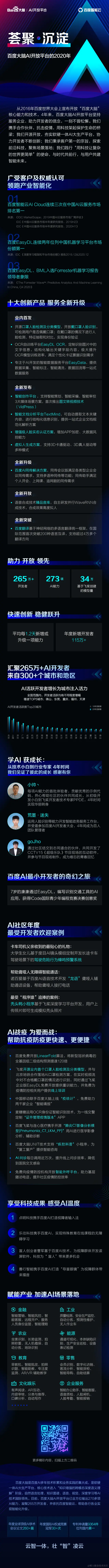 荟聚·沉淀——百度大脑AI开放平台的2020年 百度大脑 2021-02-26 86 阅读1分钟 开放273项AI能力,汇聚265万开发者 平均每1.2天新增或升级一项能力 十大创新产品,AI技术国际领先 加速AI场景落地,领跑产业智能化 …… 这些成绩的背后 离不开百度大脑对前沿科技的不断探索 和对开源开放的秉持 离不开行业合作伙伴共建智能未来的 坚定信念和持续深耕 更离不开共同促进AI技术发展的 广大开发者 智能未来已来,你准备好了吗? 让我们一同回顾百度大脑AI 开放平台的 2020!