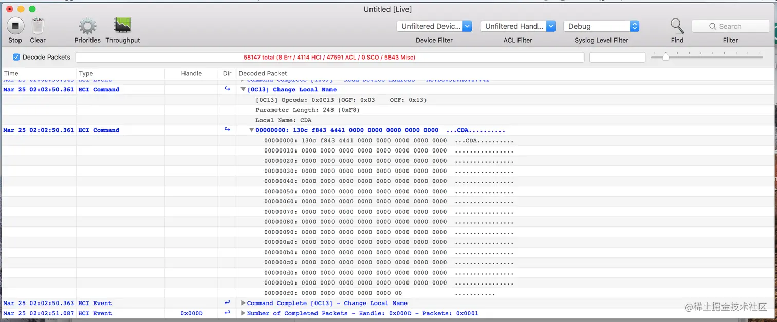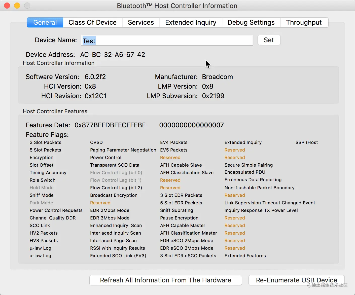 如果你在蓝牙首选项中检查,或者用LightBlue Explorer这样的应用程序发现你的蓝牙适配器,你不太可能看到你的蓝牙本地名称改变,因为这些值是缓存的。苹果公司提供了PacketLogger和BluetoothExplorer,允许你调试你的硬件(需要提升权限才能运行)。