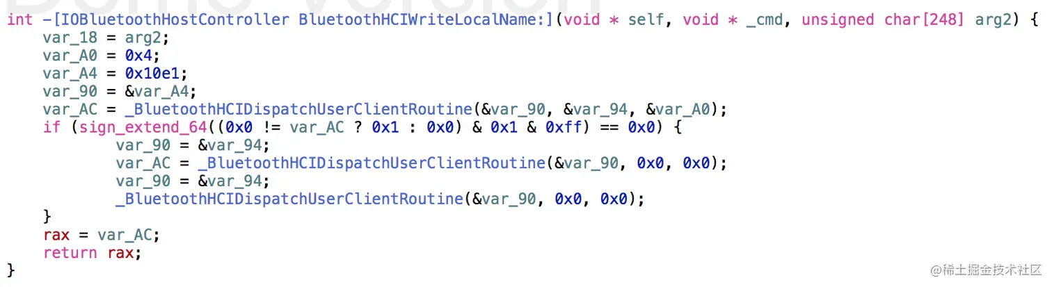 尽管对程序进行了逆向工程,但反编译后的psuedo代码只显示了传递给BluetoothHCIDispatchUserClientRoutine()的堆栈上的一个值,而没有显示它的大小或哪种结构。我能够推断出被发送的结构/数据的大小是0x74或116字节,因为在C语言中,通过memset()将结构或数据指针的内容设置为0来正确初始化结构或数据指针是标准做法。我也可以验证提供给BluetoothHCIDispatchUserClientRoutine()的数据总是116字节,因为这个值(0x74)是作为发送到IOKit服务的数据长度提供的。