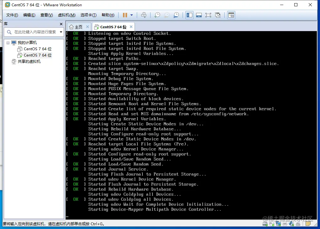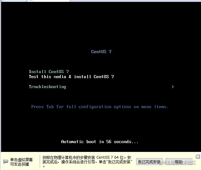 - 点击开启此虚拟机,把光标点进虚拟机,用键盘上下键选择install CentOS7,想要释放光标可以按住ctrl+alt