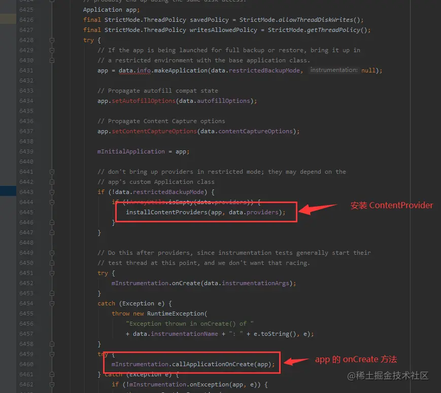 分别调用了 installContentProviders (安装 ContentProvider) 和 mInstrumentation.callApplicationOnCreate(app);(app 的 onCreate方法),到此 App 已经启动。 如下图: